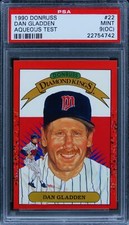 As PSA tells it, not a lot is known about this “set,” other than it features 264 cards that are pretty much identical to the base Donruss set except 1) the front features a glossy finish that was probably a test of water-based shellacking (“aqueous”) and 2) each card back is marked with a stamp that says AQUEOUS TEST.